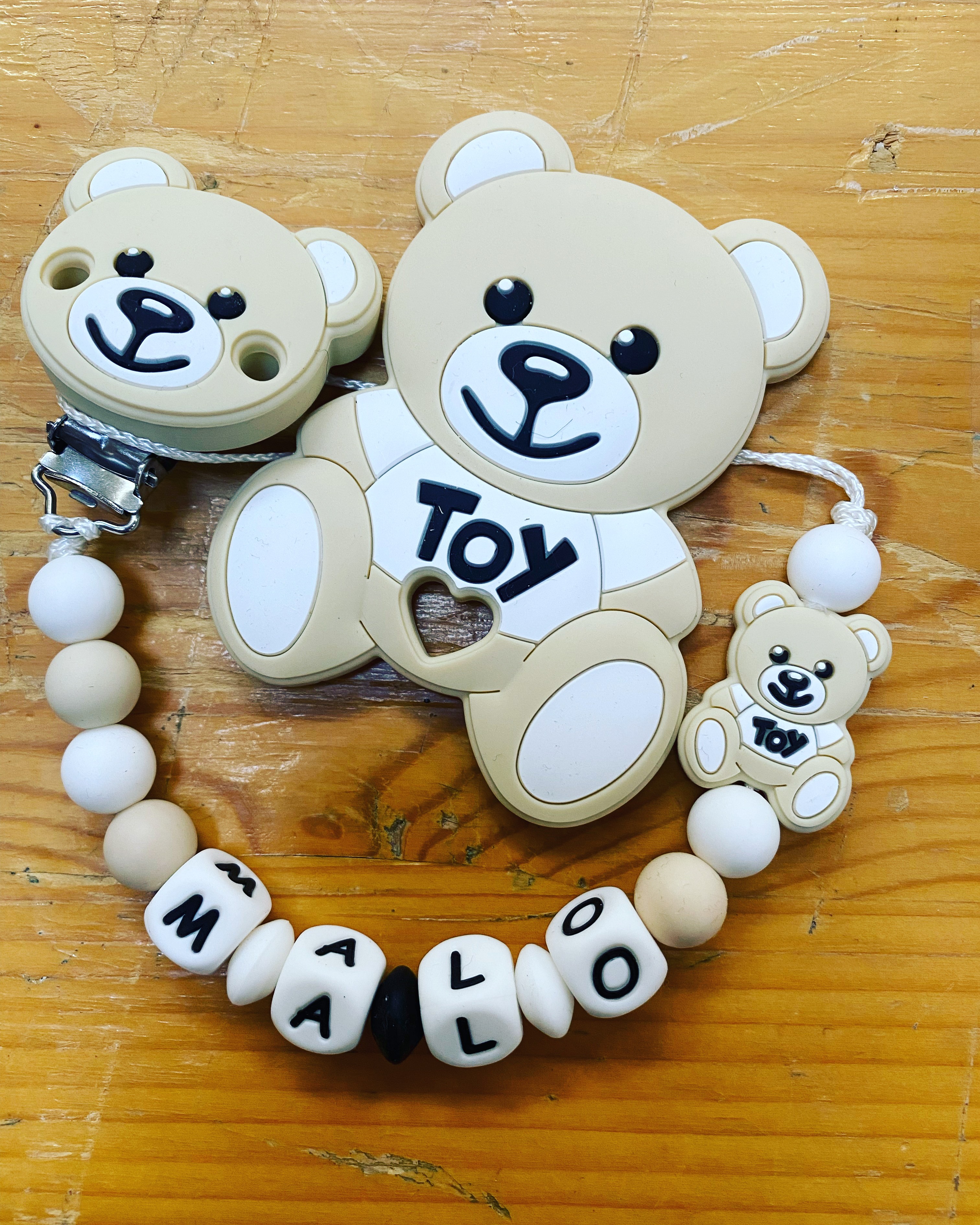 Attache tétine et anneau de dentition ourson beige clair
